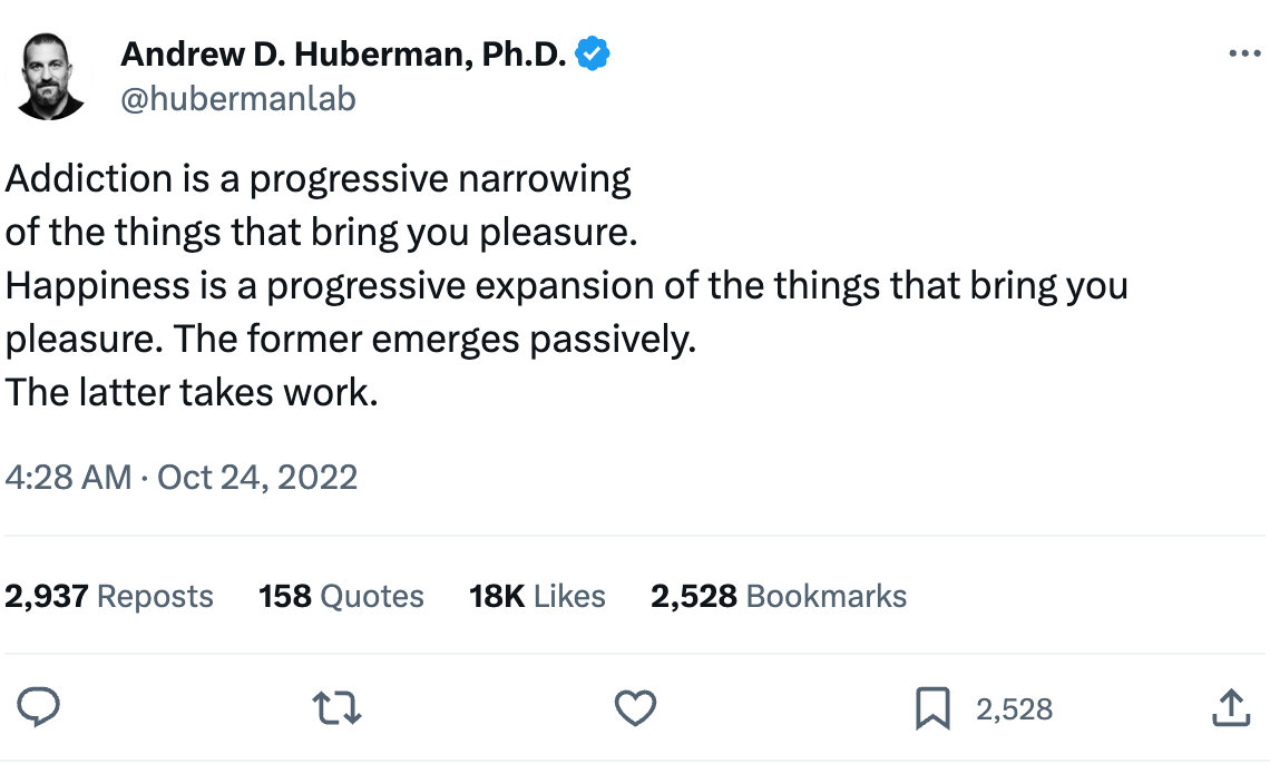 Stanford Neuroscientist Andrew Huberman has this beautiful take on Addiction & the Good Life: